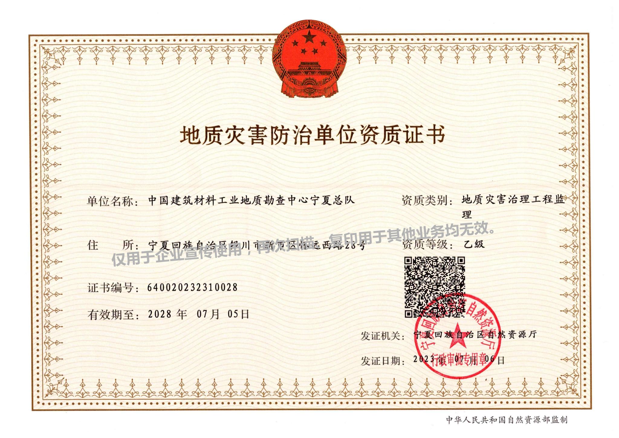 地质灾害防治单位资质证书(乙级)