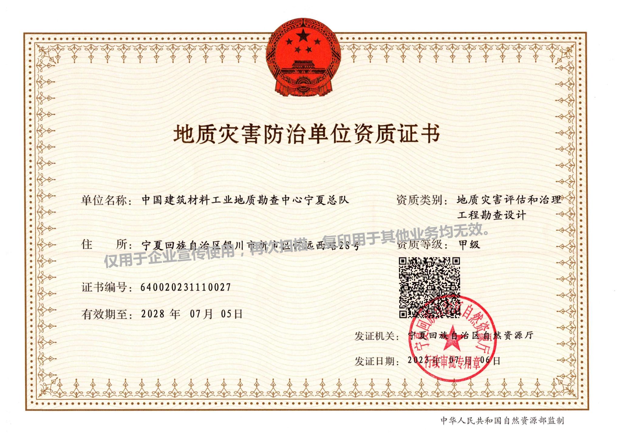 地质灾害防治单位资质证书(甲级)