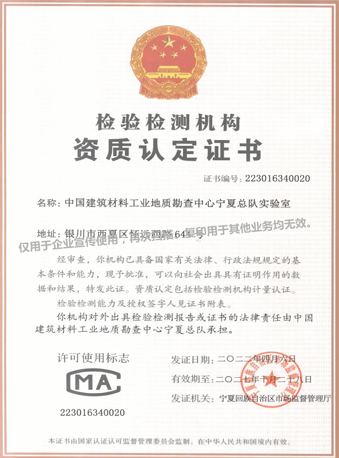 检验检测机构资质认定证书