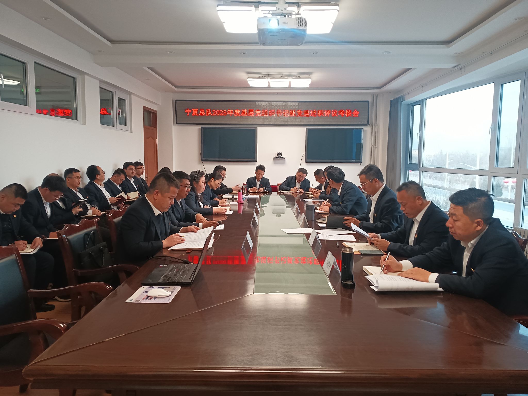 为深入学习贯彻习近平新时代中国特色社会主义思想和党的二十届四中全会精神,以打攻坚战、持久战的决心和恒心,锲而不舍落实中央八项规定精神,推进作风建设常态化长效化,以优良作风凝心聚力、真抓实干,从思想根源上解决问题,检视差距不足,进一步推动基层党支部“三基建设”,提升支部书记履职能力,1月21日,中国建筑材料地质勘查中心宁夏总队召开2025年度基层党组织负责人抓党建述职评议考核工作会议。总队党委书记梁利东出席会议并作总结点评。党委委员副总队长白佳佳主持会议,总队领导班子成员、各党支部书记和相关部门负责人、各支部党员职工代表共计25人参加会议。
